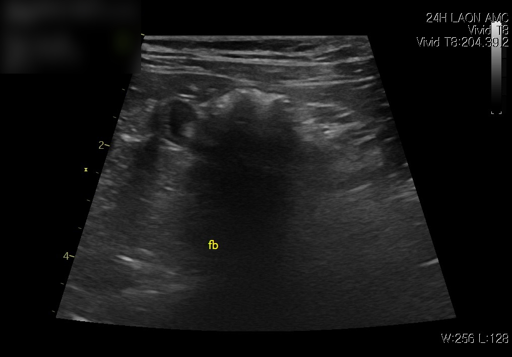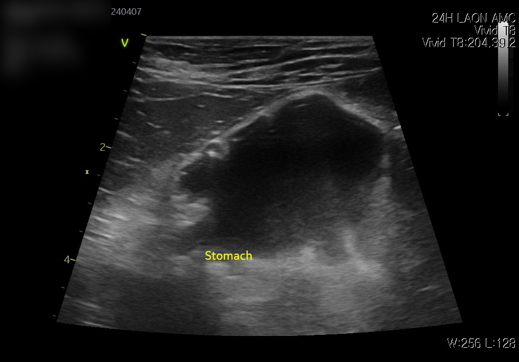 초음파 검사에서 장 내에 이물 의심 소견이 확인되었고, 이물로 인해 위 내 음식물이 내려가지 못하고 저류된 상태가 관찰되었습니다.