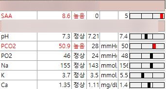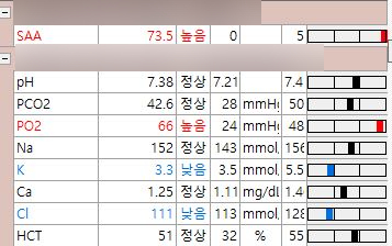 혈액검사에서는 전해질 불균형과 염증 수치 상승이 확인되었으며, 이때 측정된 SAA는 염증 정도를 확인할 수 있는 지표입니다.