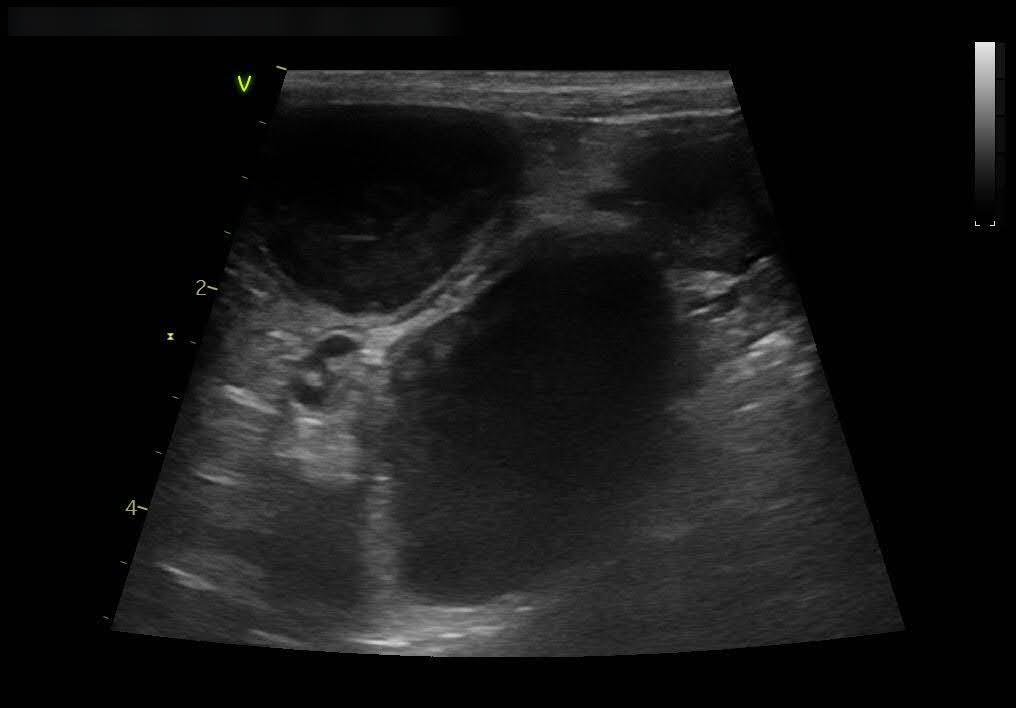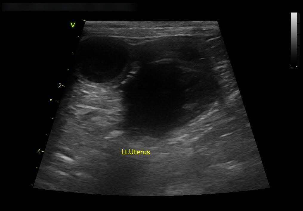 복부 영상에서는 액체로 가득 찬 비정상적으로 확장된 자궁각이 명확히 확인되었습니다.